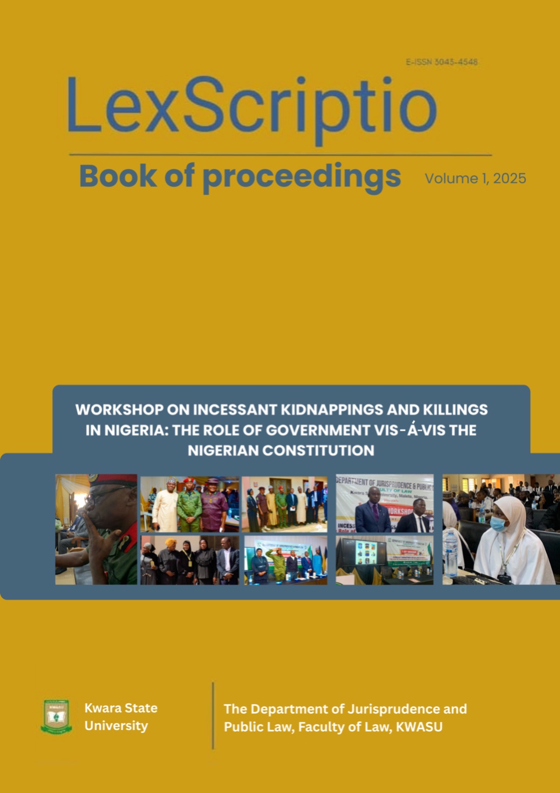 Vol. 1 No. 1 (2025)Book of Proceedings of Workshop on Incessant Kidnappings and Killings in Nigeria: The Role of the Government vis-à-vis the Nigerian Constitution. Organised by the Department of Jurisprudence and Public Law, Faculty of Law, Kwara State University, Malete. Held on 21st May 2025 at Kwara State University, International Conference Centre, Ilorin, Kwara State.